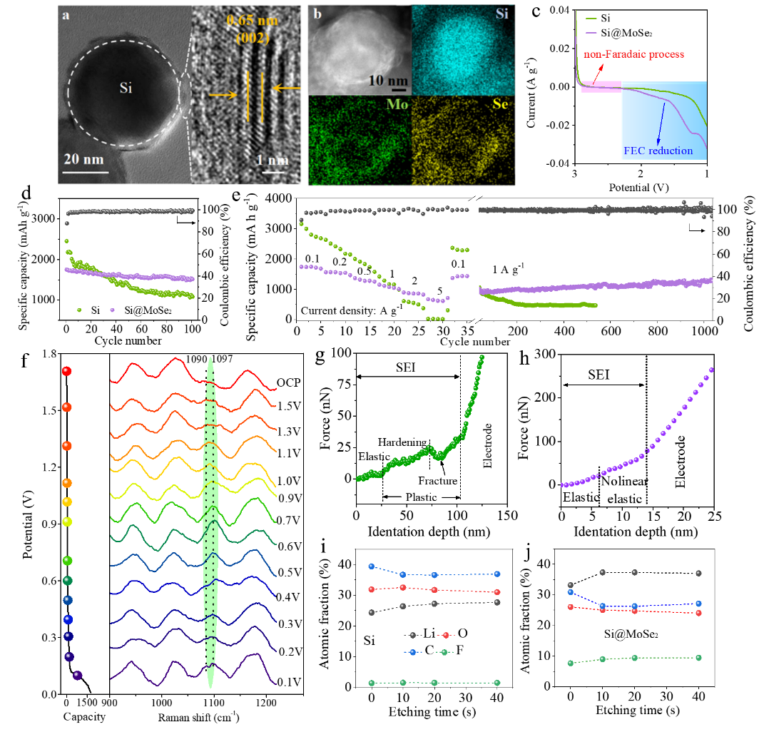 圖1 (a,b)Si@MoSe2的表征;(c,d,e)Si@MoSe2與Si電極的電化學性能;(f)首次放電中Si@MoSe2電極表面SEI的形成過程;(g-j)Si@MoSe2與Si電極表面SEI的表征。