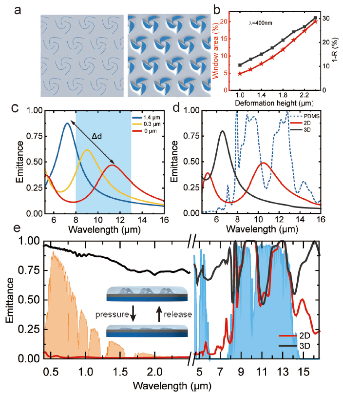 納米剪紙熱輻射器件還可以動(dòng)態(tài)控制熱輻射的波長(zhǎng)范圍和可見光的透射/吸收,從而實(shí)現(xiàn)高效的熱管理。為了證明這種能力,研究團(tuán)隊(duì)設(shè)計(jì)了一種聚合物嵌合的具有風(fēng)車形狀的納米剪紙熱管理器件(圖3)。風(fēng)車結(jié)構(gòu)可以在應(yīng)力引導(dǎo)下實(shí)現(xiàn)大的扭轉(zhuǎn)變形。一方面,在可見波段,它可以像窗口一樣動(dòng)態(tài)反射或接收太陽能。隨著變形高度的增加,納米窗口打開,窗口面積繼續(xù)增加,導(dǎo)致可見光透射和吸收增加。通過在底部設(shè)計(jì)摻雜的硅或其他吸收材料,該裝置可以有效地控制太陽能的吸收。另一方面,在紅外波段,風(fēng)車結(jié)構(gòu)可以調(diào)節(jié)熱輻射的峰值波長(zhǎng)。圖3中顯示了具有不同變形高度的風(fēng)車結(jié)構(gòu)的熱發(fā)射光譜。當(dāng)二維狀態(tài)下可以使納米結(jié)構(gòu)的發(fā)射峰位于大氣窗口的波長(zhǎng)范圍內(nèi),而三維狀態(tài)下使發(fā)射波長(zhǎng)在大氣窗口之外,這種動(dòng)態(tài)的調(diào)控是通過將剪紙結(jié)構(gòu)內(nèi)嵌進(jìn)彈性聚合物中實(shí)現(xiàn)的。