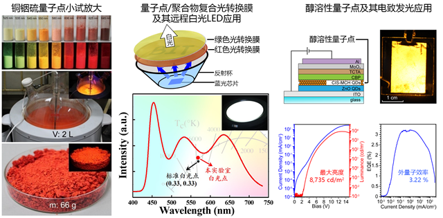 圖1 CuInS2量子點的小試放大及其遠程白光LED燈具和電致發光顯示應用