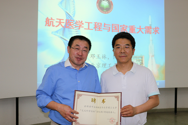 報(bào)告結(jié)束后,北京理工大學(xué)高層次人才發(fā)展中心副主任金海波教授為鄧玉林教授頒發(fā)了“特邀報(bào)告人”聘書,并對(duì)鄧教授帶領(lǐng)團(tuán)隊(duì)研制的生命“小立方”成功搭載“天舟”表示祝賀。