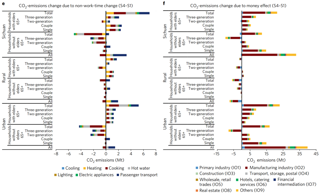 該研究結(jié)果表明,中國欠發(fā)達省份例如四川,2030年人口老齡化和家庭規(guī)模小型化將增加全社會的碳排放,其他以煤炭為主導(dǎo)的欠發(fā)達省份受人口結(jié)構(gòu)轉(zhuǎn)型的影響將更為顯著。在未來的能源消耗和碳排放預(yù)測情景中,若不考慮人口結(jié)構(gòu)轉(zhuǎn)型及其伴隨的生活模式改變,則能源消耗和碳排放被明顯低估,其中由于人口結(jié)構(gòu)變化引起的消費模式改變貢獻占7.2%,工作時間變化貢獻占86.1%,非工作時間變化貢獻占6.7%。被低估的碳排放主要來源于老齡化家庭和小型家庭對取暖、炊事、熱水和交通服務(wù)的需求增長以及對制造業(yè)、住宿和餐飲業(yè)、以及醫(yī)療、教育、文化、娛樂等其他服務(wù)業(yè)的產(chǎn)品和服務(wù)需求的增加。此外,與基準年相比,由人口結(jié)構(gòu)轉(zhuǎn)型引起的工作時間和非工作時間變化將增加97 Mt的二氧化碳排放,約占全社會排放總量的12%。研究結(jié)果定量驗證了人口結(jié)構(gòu)變化對能耗和碳排放的影響,提供了從時間利用的角度深入開展環(huán)境分析的新視角。