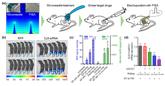(a)微針滾輪及柔性插指電極實物圖、電場模擬圖,以及該電穿孔策略的操作步驟;(b)RFP、siRNA電穿孔后小鼠活體成像結果;(c)RFP、siRNA電穿孔后定量分析結果;(d)siRNA介導皮膚中靶基因的表達沉默。