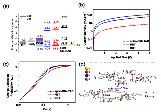 圖2 (a)三種有機分子的能級分布和與PVSK的匹配程度;(b)“SCLC”法測試有機分子的空穴遷移率;(c)三種有機分子的電荷收集概率PC ;(d)NDT分子晶體結構中的 π-π堆積和 O-π堆積。
