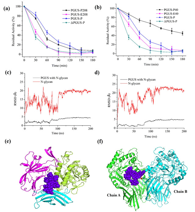 北京理工大學(xué)化學(xué)與化工學(xué)院李春教授課題組在前期完成晶體結(jié)構(gòu)解析的真菌β-葡萄糖醛酸酶(PGUS,同源四聚體結(jié)構(gòu))為模型蛋白,并將其在畢赤酵母(能夠在蛋白質(zhì)的特定位點(diǎn)引入高甘露糖型糖鏈)中異源表達(dá)(PGUS-P),驗(yàn)證了蛋白質(zhì)內(nèi)源的Asn383和Asn594位點(diǎn)的糖基化對(duì)PGUS-P的穩(wěn)定性有顯著影響。通過(guò)計(jì)算機(jī)模擬與實(shí)驗(yàn)相結(jié)合的方法,揭示了PGUS-P的兩個(gè)內(nèi)源N-糖基功能類(lèi)似于“連接臂”,能將空間上距離相近的超二級(jí)結(jié)構(gòu)域相連,使得其局部結(jié)構(gòu)更加緊湊,從而提高了蛋白質(zhì)的整體穩(wěn)定性(圖1)。以此為啟發(fā),研究人員通過(guò)對(duì)PGUS的晶體結(jié)構(gòu)分析,在超二級(jí)結(jié)構(gòu)域、結(jié)構(gòu)域、亞基界面間設(shè)計(jì)了N-糖基化位點(diǎn),進(jìn)一步提高了PGUS-P的動(dòng)力學(xué)、熱力學(xué)穩(wěn)定性。酶學(xué)性質(zhì)表征并結(jié)合全原子分子動(dòng)力學(xué)模擬結(jié)果表明,在結(jié)構(gòu)域界面間的Asn208位糖鏈和周?chē)€(gè)結(jié)構(gòu)域產(chǎn)生的作用力,形成了“糖橋”構(gòu)型,將蛋白質(zhì)在70°C下的半衰期提高了2.7倍,去折疊自由能提高了8.4 kJ/mol;而在亞基界面間的Asn40位糖鏈通過(guò)和相鄰亞基的作用,形成了“糖卡”構(gòu)型,將熱穩(wěn)定性提高了7.1倍,去折疊自由能提高了14.6 kJ/mol,同時(shí)酶的催化效率也提高了1.7倍(圖2)。