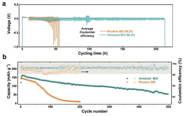 MCI保護界面的金屬鋰負極用在匹配鎳鈷錳三元正極(NMC532)的全電池中,電池的平均庫倫效率達到了99.8 %;電池的續航能力和穩定性也被顯著提升,相比于傳統的電極界面中電池經過100次循環后容量降低到50 mAh g-1,具有MCI保護層界面的電池在0.5 C (2小時充滿額定容量)充放電倍率下,經過500次循環容量依然維持在50 mAh g-1,將電池的壽命延長了5倍。