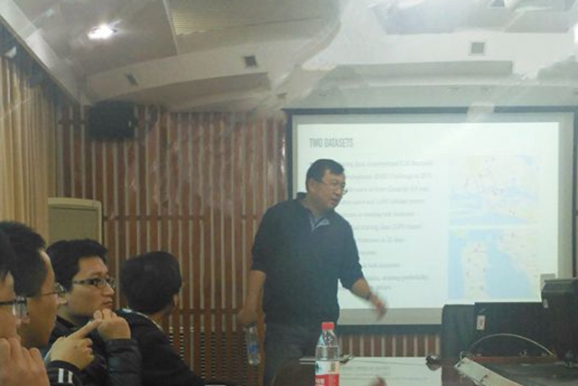 YuWang教授的報告題目為《群智感知中的參與者選擇算法》。報告中,Yu Wang教授向大家詳細介紹了群智感知技術的起源與發展背景、主要應用,并落腳在保障數據質量和用戶隱私的參與者選擇算法。報告結束后,他對老師和同學們關心的科研相關問題一一進行了解答。