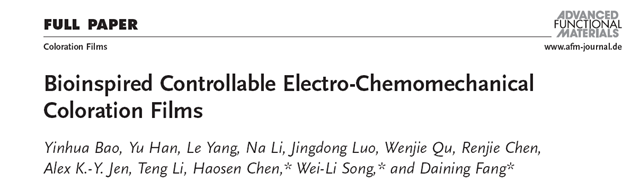 2018 年11月17日,著名材料學期刊 《先進功能材料》 (Advanced Functional Materials, 2018, 1806383.)在線報道了北京理工大學先進結構技術研究院方岱寧院士,陳浩森副教授,和宋維力副教授合作領導研究的一種全新的基于電化學精確控制的,硅基電化學-力學-光學耦合仿生變色器件。該項研究基于全新的電化學-力學耦合變色調控機理,實現了可見光寬頻段精確調控,并具有獨特的彩色/銀色切換功能。