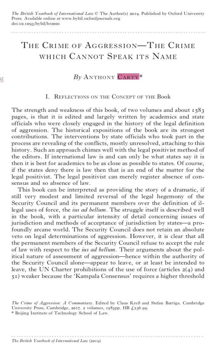 在英國(guó)國(guó)際法年刊上發(fā)表的The Crime of Aggression –The Crime which Cannot Speak its Name一文分析了將侵略罪引入《國(guó)際刑事法院規(guī)約》的法律意義。文章認(rèn)為,安理會(huì)常任理事國(guó)拒絕接受編纂該法律的做法是明智的,否則會(huì)違背《聯(lián)合國(guó)憲章》禁止使用武力規(guī)則。Carty認(rèn)為,國(guó)際社會(huì)有必要重新考慮國(guó)際法的基礎(chǔ),從而克服各國(guó)間彼此感到的巨大焦慮和不安。要維護(hù)世界和平,需要各國(guó)人民重新發(fā)現(xiàn)并對(duì)正義、相互尊重和相互理解達(dá)成共識(shí).