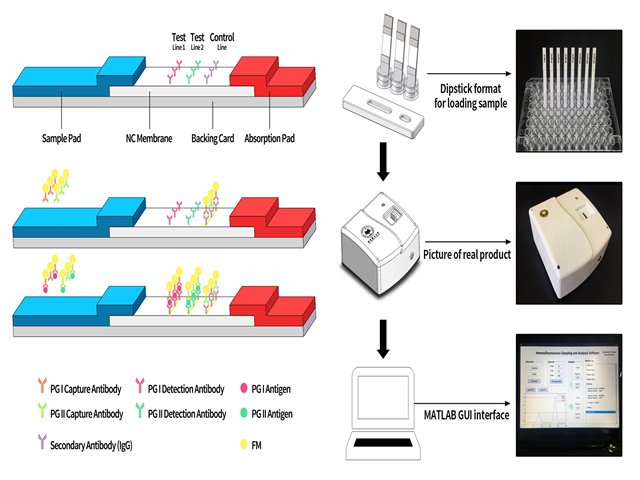 胃癌的早期診斷和治療是胃癌防治的重要手段,可以提高存活率并對預后防控提供有效的指導,所以應在胃癌高發地區大力推廣早癌篩查工作。胃蛋白酶原(PG)屬于胃粘膜分泌的特定蛋白酶組,可分為兩大類:胃蛋白酶原I(PG I)和胃蛋白酶原II(PG II)。PG的分泌水平反映了胃粘膜的形態和功能狀態,被在同樣是胃癌高發地區的日本和韓國作為胃癌篩查的生物標志物應用于全國范圍性的篩查工作。然而,目前用于檢測PG I和PG II的方法耗時耗力,且需要專業的實驗室環境配備,不適用于我國的胃癌大規模篩查,亟需一種可以實現快速且靈敏的PG I和PG II同時檢測方法,為大規模胃癌篩查提供可行方案。