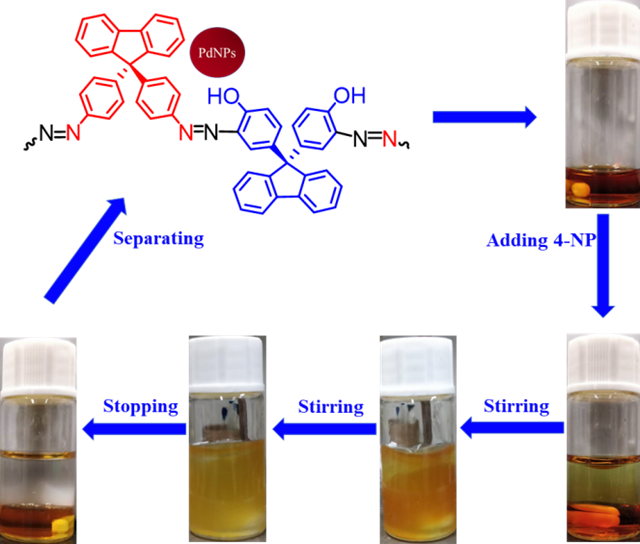 廢水中對硝基苯酚的去除和轉(zhuǎn)化與人類的健康信息相關(guān),是可持續(xù)發(fā)展研究的重要內(nèi)容,也是檢驗催化劑性能的經(jīng)典反應(yīng)。通過“異相反應(yīng)均相化”的策略,該工作利用可溶性的有機多孔聚合物Azo-POP-7負載貴金屬Pd,得到了分布均一,尺寸極小的納米Pd顆粒(< 2nm)。同時,負載金屬Pd后的Pd@Azo-POP-7仍能保持優(yōu)異的溶解性,并用于有機/水兩相中催化對硝基苯酚的還原。