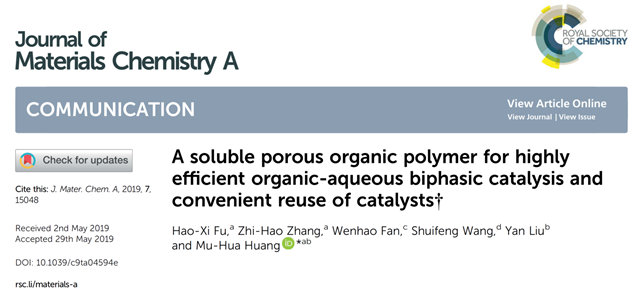 有機多孔聚合物(POPs)是一種新興的多孔材料,具有廣泛的應(yīng)用前景。北京理工大學材料學院的黃木華課題組長期以來關(guān)注功能性有機多孔聚合物的實用制備及應(yīng)用技術(shù)。該小組先后實現(xiàn)了Cu粉催化的Ullmann偶聯(lián)反應(yīng)制備硝基功能化的有機多孔材料NO2-PAF-1(Polym. Chem., 2016, 7, 770),利用NaBH4介導的還原偶聯(lián)反應(yīng),快速制備了偶氮鍵鏈接的有機多孔聚合物材料Azo-POP-1、Azo-POP-2和Azo-POP-3(J. Mater. Chem. A, 2018, 6, 5608)。該工作報道了第一例可溶性的Azo-POPs,并創(chuàng)新性地將可溶性的Azo-POPs用于有機/水兩相催化反應(yīng),取得了良好的催化效果和催化劑的循環(huán)使用性,為可持續(xù)發(fā)展提供了技術(shù)支持。該工作發(fā)表在《Journal of Materials Chemistry A》 (A Soluble Porous Organic Polymer for Highly Efficient Organic-Aqueous Biphasic Catalysis and Convenient Reuse of Catalysts, 2019. 7 (25): p. 15048-15053. DOI: 10.1039/C9TA04594E)(SCI頂級期刊,影響因子10.73)上。碩士研究生付浩熹為該論文的第一作者,黃木華特別研究員為通訊作者。該工作得到了國家自然科學基金(No. 21772013)、北京市自然科學基金(No. 2162039)以及中央高校基本科研業(yè)務(wù)費專項基金的大力資助。同時,該工作也得到了材料學院先進材料實驗中心的大力支持。