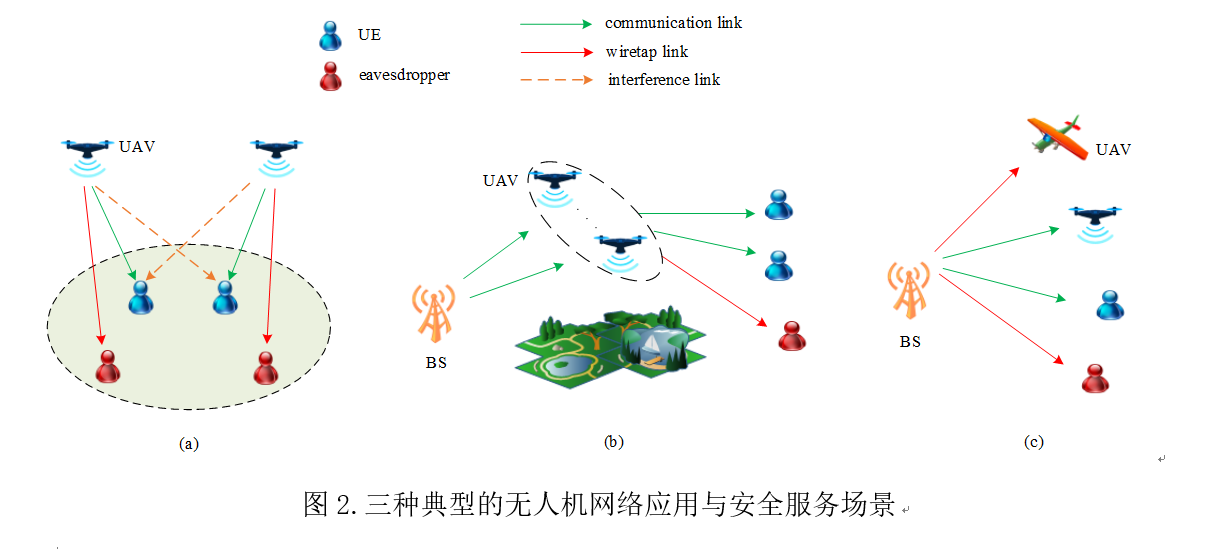 無人機搭載的無線通信網絡是一個動態的分層網絡,其傳輸的數據易受未授權用戶的竊聽,因此安全傳輸是一個重要課題。該研究團隊引入了三種典型的無人機網絡竊聽場景如圖2所示。(1)在無人機輔助基站覆蓋場景中,通過部署無人機平臺充當移動的空中基站,并輔以現有的網絡架構進行無線信息傳輸,可以實現無線網絡覆蓋區域的快速移動;(2)無人機可作為空中移動中繼為遠距離用戶或用戶群之間提供無線連接;(3)無人機可作為空中用戶與地面用戶共存,支持物聯網的應用,特別是航空貨運服務(如亞馬遜Prime Air和谷歌Wing項目)。