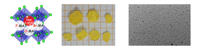 圖1 鹵代銨鹽及其鈣鈦礦三維結(jié)構(gòu)示意圖,F(xiàn)MAPbBr3鈣鈦礦單晶和FMAPbBr3鈣鈦礦量子點(diǎn)