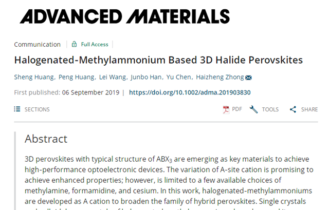 近日,北京理工大學(xué)材料學(xué)院鐘海政課題組在鈣鈦礦材料A位分子的設(shè)計和制備方面取得突破進(jìn)展,于2019年9月6日在材料領(lǐng)域的頂級期刊《Advanced Materials》上在線發(fā)表, Halogenated-Methylammonium Based 3D Halide Perovskites, Advanced Materials 2019, 31, 1903830 (https://onlinelibrary.wiley.com/doi/10.1002/adma.201903830)。論文發(fā)表后很快獲得“納米人”等學(xué)術(shù)媒體關(guān)注和報道。