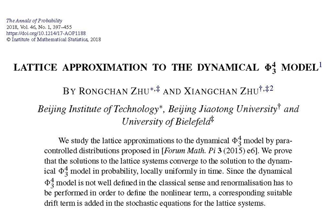 動力模型,取得了一系列的研究成果。相關結果發表在國際數學一流期刊《The annals of probability》《Journal of differential equations》等上。這些結果多次被Hairer、Gubinelli等數學家引用。