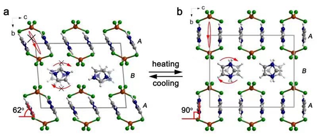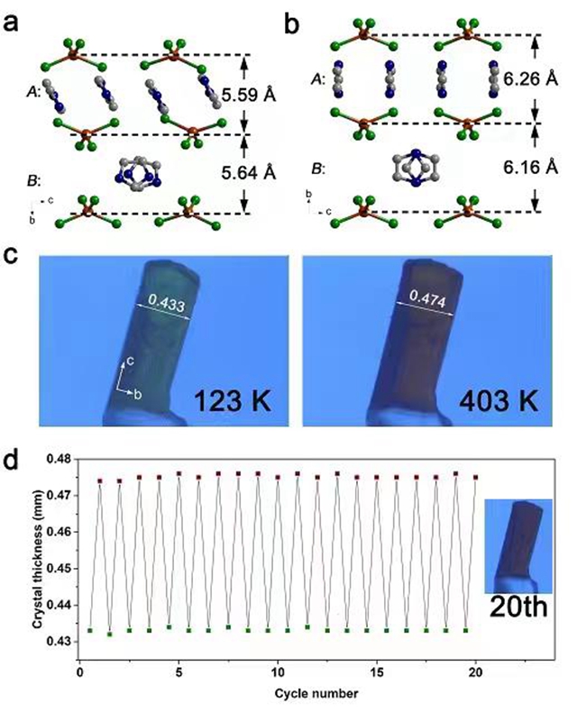 該課題組在前期草酸根離子分子轉動研究工作的基礎上 (Nature Chemistry, 2014, 6, 1079-1083;Angew. Chem. Int. Ed. 2017, 56, 717-721),受陀螺、輪子等宏觀進動現象的進一步啟發,提出了以分子輪作為熵源,利用分子輪“進動”驅動單晶材料巨熱膨脹的設計思路。通過化學熱力學控制分子輪 (咪唑陽離子) 靜止-轉動過程中的分子指向變化這一“進動”行為,設計開發了一種新型的巨熱膨脹材料。該材料在一個方向表現出極大的正熱膨脹 (α = 839 × 10?6 K?1),而在垂直方向表現出巨負熱膨脹性質 (α = ?363 × 10?6 K?1)。伴隨著巨熱膨脹,單晶材料的宏觀尺寸可發生10%的機械伸縮,并且幾十次循環后未發現明顯性能變化,表明該材料機械性質具有良好的抗疲勞性。結合變溫單晶X?射線衍射,變溫固體NMR測試、理論計算以及Hirshfeld表面分析,作者對分子運動的詳細機理進行了深入的研究分析,為今后相關材料的設計開發提供了進一步的研究思路。