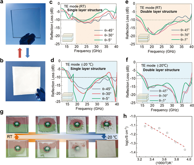 圖3 不同透光狀態(tài)下的多層隱身結(jié)構(gòu)進行性能實測:(a)室溫下光學透明多層隱身結(jié)構(gòu);(b) -20攝氏度下光學不透明多層隱身結(jié)構(gòu);(c)使用單層凝膠的多層隱身結(jié)構(gòu)的常溫透明狀態(tài)下實測電磁隱身性能;(d) 使用單層凝膠的多層隱身結(jié)構(gòu)的-20攝氏度下非透光狀態(tài)下實測電磁隱身性能;(e) 使用雙層凝膠的多層隱身結(jié)構(gòu)的常溫透明狀態(tài)下實測電磁隱身性能;(f) 使用雙層凝膠的多層隱身結(jié)構(gòu)的-20攝氏度下非透光狀態(tài)下實測電磁隱身性能;(g)溫度調(diào)控的透光實驗驗證;(h) ?20~30 °C下凝膠的離子電導率。