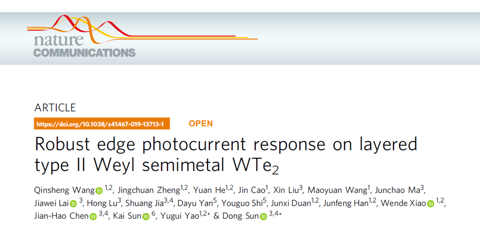 近日,北京理工大學物理學院姚裕貴教授、王欽生特別副研究員及團隊成員,同北京大學量子材料中心孫棟研究員等合作者,在第二類外爾半金屬材料WTe2光電響應研究方面取得重要進展。他們利用掃描光電流譜方法對第二類外爾半金屬材料WTe2光電響應進行了系統的研究,發(fā)現在該材料邊界處具有反常的光電流響應(圖1),并且邊界對稱性的高低決定了該反常光電流響應的有無。該工作提出了利用材料低對稱性邊界的晶體場作為光生電子-空穴對分離的有效手段,并討論了拓撲邊緣態(tài)對于光電響應的可能影響,為拓撲半金屬材料在光電探測等方面的應用提供了新的思路。相關成果最近發(fā)表在Nature Communications上。