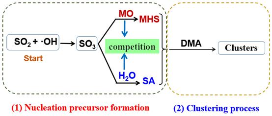 圖1  成核前驅(qū)體(硫酸(SA)和硫酸甲酯(MHS))的競爭生成過程及其后續(xù)形成團(tuán)簇的過程。甲醇:MO,二甲胺:DMA。