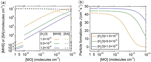 圖2(a)不同水濃度下,由SO3生成的硫酸甲酯(MHS)和硫酸(SA)的濃度(cm-3)隨甲醇(MO)濃度的變化。(b)不同水濃度下,粒子形成速率J (cm-3 s-1)隨著 MO濃度的變化。