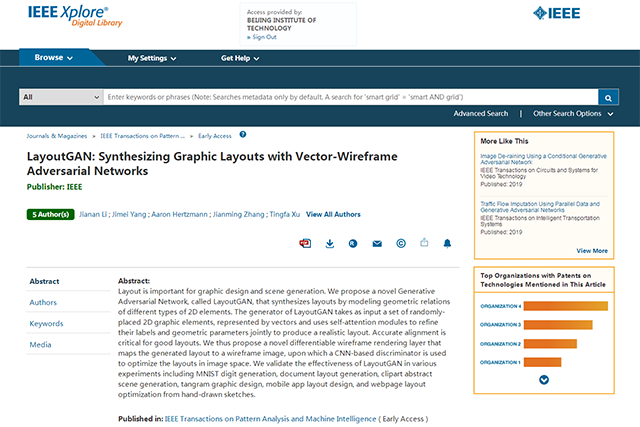 近日,北京理工大學光電學院許廷發教授與指導的李佳男博士生的研究成果“LayoutGAN: Synthesizing Graphic Layouts with Vector-Wireframe Adversarial Networks”被IEEE旗下,模式識別和機器學習領域國際頂級期刊IEEE Transactions on Pattern Analysis and Machine Intelligence發表。該研究成果由許廷發教授團隊與美國Adobe公司、加拿大多倫多大學合作完成。