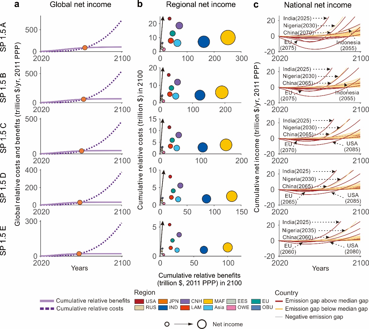 研究團隊基于模型結果,編制了后巴黎協定時代實現溫控目標的國家自主減排貢獻改進的全球方案;預測了不同方案下各國扭虧為盈的時間;量化了實現扭虧為盈的前期投資,為NDC目標更新、全球盤點以及國家間資金和技術轉移提供了科學依據。