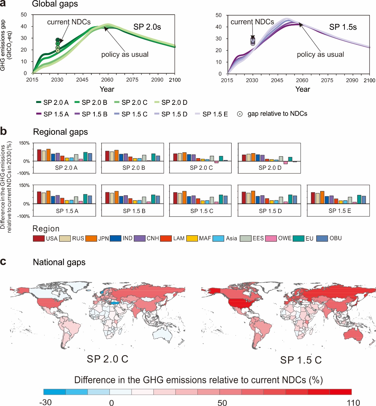 就目前而言,大部分國家自主減排目標缺乏雄心。為了實現長期溫控目標和經濟收益,2030年,全球需要在現有NDC基礎上進一步減排19-29和28-30吉噸二氧化碳當量以實現2度和1.5度溫控目標。所有國家和地區均需在現有NDC基礎上進一步提高減排力度。其中,日本、美國、俄羅斯、歐盟、中國需要付出更多的努力,在本世紀中葉之前需要實現凈零排放。