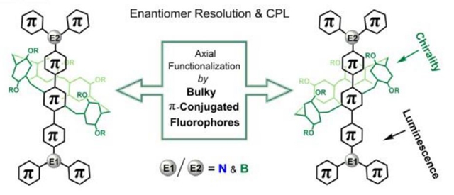 柱芳烴是新一代超分子大環主體的典型代表,被廣泛應用于超分子組裝和主客體化學,同一作者近期報道了一種高彈性的自修復仿生高分子凝膠材料(ACS Appl. Polym. Mater. 2019, 1, 2224)。通常,柱芳烴的一對立體異構體由于芳環的快速翻轉而失去旋光性,因此如何有效地阻止其外消旋化成為領域關注的焦點。2019年,該課題組發現在聚集態可以有效抑制苯環旋轉來提高發光效率(J. Mater. Chem. C 2019, 7, 11747),但仍然難以獲得光學純對映體。該課題組在有機硼長期研究的基礎上,利用三芳基硼和三苯胺特有的發光性能和空間結構,首次將有機硼化學與柱芳烴相結合,制備了一種軸向共軛的柱芳烴衍生物(P5BN)。三苯胺(Donor)和三芳基硼(Acceptor)顯著的空間效應有效抑制了芳環的翻轉,使其對映異構體獲得高效的手性拆分,我們率先報道了基于柱芳烴的圓偏振發光材料。而且,分子內的電荷轉移賦予了該材料獨特的溫度響應性能,是一種潛在的低溫熒光探針。該工作不僅在手性小分子識別方向具有可觀的應用前景,同時極大地推動了手性CPL大環材料的發展。