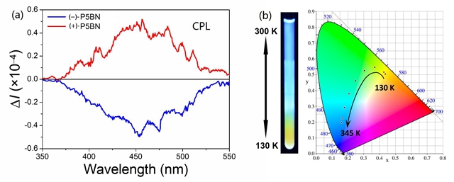 圖2 (a) P5BN在固態CPL譜圖;(b) P5BN熱響應熒光變色現象。
