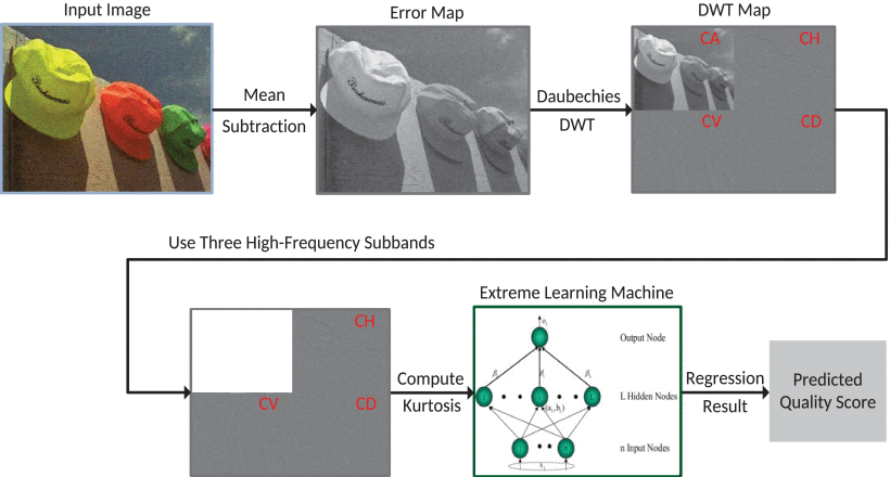 統計特征是從自然圖像特有的統計規律中提取的描述量,其特性會隨著圖像噪聲污染程度變化而改變。該團隊研究小波系數的統計特性,發現低噪聲或無噪聲自然圖像的小波系數具有細峰、尖峰的分布;而有噪聲的圖像往往是平頂的,尾部較淺的分布。根據上述規律,設計了峰態特征來精確描述圖像受噪聲污染的程度,構建靈活的回歸模型對多種噪聲類型進行擬合,最終利用快速超限學習機技術,將提取的圖像小波系數峰態統計特征映射到圖像質量上,完成對待檢測圖像質量的評價。該項工作為實現圖像準確、高效的無參考評價提供了新的思路。