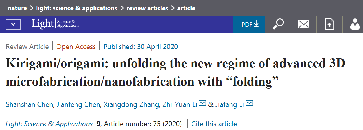 文章信息:Shanshan Chen#, Jianfeng Chen#, Xiangdong Zhang, Zhi-Yuan Li* and Jiafang Li*, “Kirigami/origami: unfolding the new regime of advanced 3D microfabrication/nanofabrication with “folding””, Light: Science & Applications 9, 75 (2020).(#為共同一作;*為通訊作者) 文章鏈接:https://www.nature.com/articles/s41377-020-0309-9