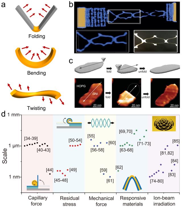 圖1 微納尺度剪紙/折紙的基本形變特點(折疊、彎曲、扭曲)、石墨烯剪紙/折紙、及應力激勵方式