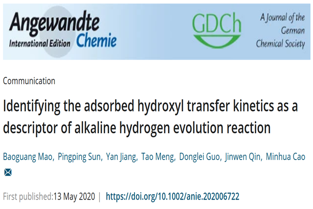 論文詳情:Baoguang Mao, Pingping Sun, Yan Jiang, Tao Meng, Donglei Guo, Jinwen Qin, Minhua Cao*. Identifying the adsorbed hydroxyl transfer kinetics as a descriptor of alkaline hydrogen evolution reaction, Angewandte Chemie International Edition, doi: 10.1002/anie.202006722. 論文鏈接:https://onlinelibrary.wiley.com/doi/abs/10.1002/anie.202006722