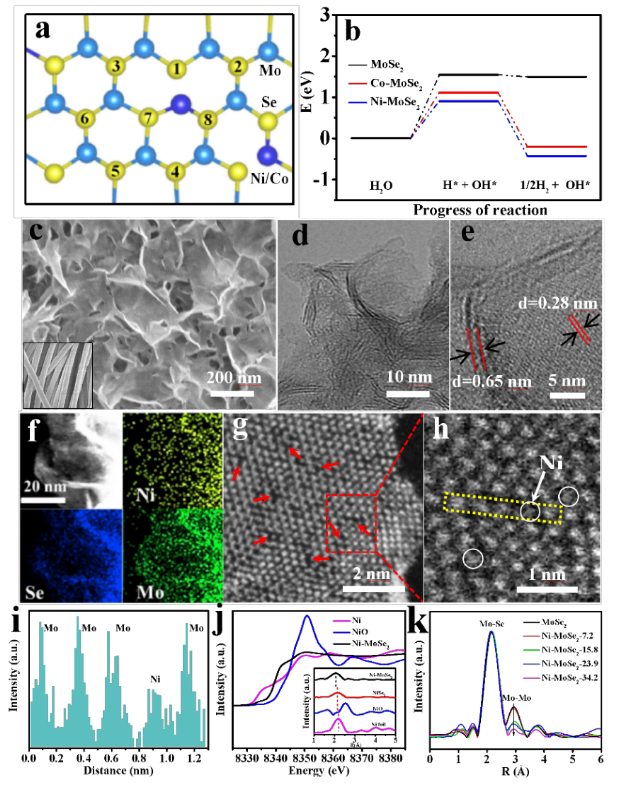 圖1:Ni/Co-MoSe2結構模型及催化劑形貌和結構表征。
