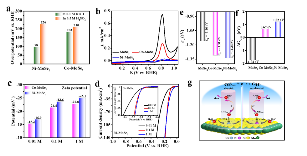 圖2:(a)堿性和酸性介質中HER活性比較;(b,c,d)CV、 Zeta電位及不同堿性介質下HER催化活性表征;(e,f)DFT理論計算分析OHad + e ? OH轉化過程;(g)Ni/Co-MoSe2對 OHad + e ? OH過程的作用機制示意圖。