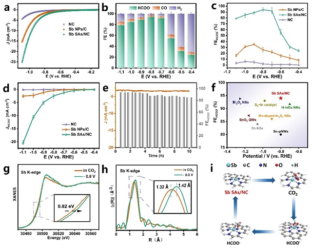 人類向大氣中排放的二氧化碳不斷增加,引起了巨大的氣候變化。利用可持續能源發電,將二氧化碳轉化為一系列高附加值產品,作為解決能源短缺和環境問題的有效途徑,越來越受到重視。甲酸或甲酸鹽是一類重要的儲氫材料,也是許多工業反應中的關鍵化學中間體,電化學方法還原CO2生產甲酸或甲酸鹽被認為是目前最具經濟可行性的技術方案。陳文星等構筑了一種以Sb-N4為主體的Sb單原子催化劑(Sb SAs/NC)可以高效催化CO2RR轉化為甲酸鹽,Sb SAs/NC在?0.8 V (vs. RHE)下表現出高達94.0%的甲酸法拉第效率。原位X射線吸收精細結構(XAFS)研究和密度泛函理論(DFT)計算表明,優異的CO2RR活性來源于帶正電的Sbδ+-N4(0<δ<3)活性中心。本研究結果對原子尺度上合理設計和精確調控CO2RR的主族金屬(Sb、In、Sn、Bi等)催化劑具有重要的指導意義。