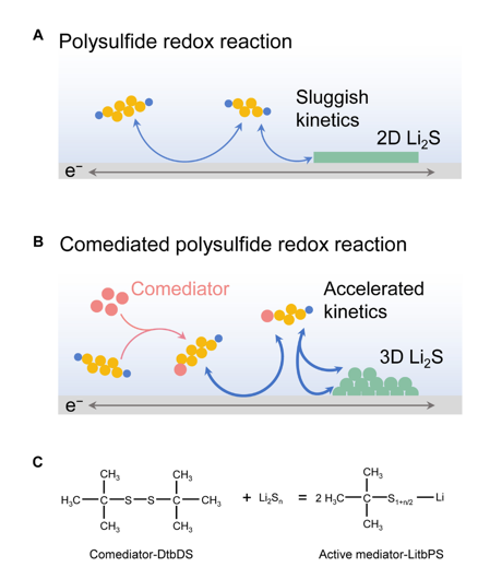 近日,Cell出版社化學旗艦雜志《Chem》(影響因子19.7)報道了北京理工大學前沿交叉科學研究院黃佳琦課題組在鋰硫電池動力學調控方面的研究新進展,相關研究成果以“An Organopolysulfide Comediator for Accelerating Sulfur Redox Kinetics in Lithium–Sulfur Batteries”為題在線發表。該工作第一作者為北京理工大學博士研究生趙夢,通訊作者為北京理工大學黃佳琦教授。