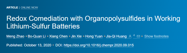 論文詳情:Meng Zhao, Bo-Quan Li, Xiang Chen, Jin Xie, Hong Yuan, Jia-Qi Huang*. Redox comediation with organopolysulfides in working lithium-sulfur batteries, Chem 2020, 10.1016/j.chempr.2020.09.015.