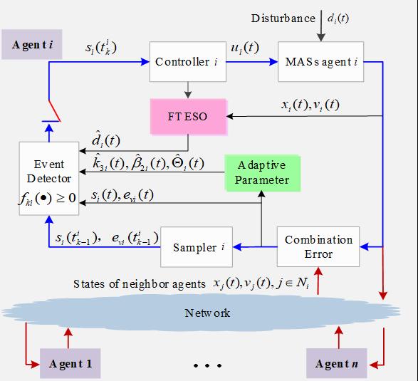 獲獎論文在王佳楠副教授指導下,由博士后王丹丹和研究生閉昌瑀共同撰寫完成。文章針對帶有干擾的二階多飛行器系統,首次利用非奇異終端滑模方法和自適應增益方法,設計了一種全新的完全分布式事件觸發控制協議,并提出了4個事件觸發條件,與單個事件觸發條件相比,具有更高精度和更低觸發頻率,通過引入一種有限時間擴張狀態觀測器,進一步降低了觸發次數和抖振頻率,根據李雅普諾夫定理證明了閉環系統實際有限時間穩定性。