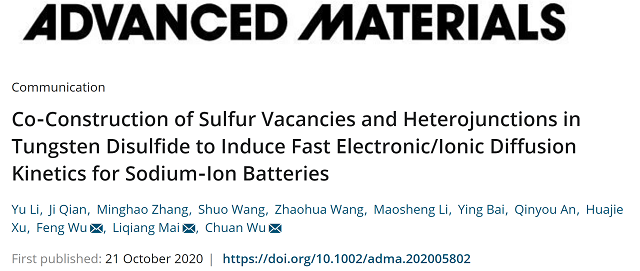 近日,北京理工大學(xué)材料學(xué)院吳鋒院士團(tuán)隊(duì)在鈉離子電池材料的結(jié)構(gòu)設(shè)計(jì)和性能優(yōu)化方面取得重要突破。材料類國際頂級期刊《Advanced Materials》(《先進(jìn)材料》,影響因子27.398)以“Co-Construction of Sulfur Vacancies and Heterojunctions in Tungsten Disulfide to Induce Fast Electronic/Ionic Diffusion Kinetics for Sodium-Ion Batteries”為題在線報道了這一研究進(jìn)展。該工作由吳鋒院士團(tuán)隊(duì)的吳川教授課題組完成,北京理工大學(xué)材料學(xué)院博士后李雨為第一作者,北京理工大學(xué)吳鋒院士、吳川教授和武漢理工大學(xué)麥立強(qiáng)教授為共同通訊作者(文獻(xiàn)鏈接:https://onlinelibrary.wiley.com/doi/10.1002/adma.202005802)。