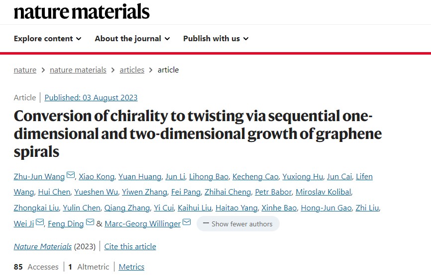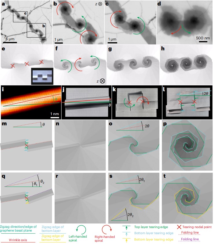 近日,北京理工大學前沿交叉科學研究院黃元教授與上海科技大學王竹君教授、中國人民大學季威教授,深圳理工大學丁峰教授,以及中國科學院物理研究所高鴻鈞院士等國內外團隊開展合作,在二維材料褶皺研究中取得了新的進展。在該工作中,團隊合作者利用石墨烯褶皺發展了新型制備螺旋石墨烯的折紙剪紙技術[8],為揭示螺旋石墨的生長機理以及研究角度依賴的石墨烯量子效應等奠定了堅實的理論基礎,文章發表在國際學術期刊《Nature Materials》上(題目:Conversion of chirality to twisting via sequential one-dimensional and two-dimensional growth of graphene spirals),黃元教授為本工作的共同第一作者,王竹君教授,季威教授,丁峰教授,以及德國慕尼黑工業大學Marc-Georg Willinger?教授為本工作的共同通訊作者。
