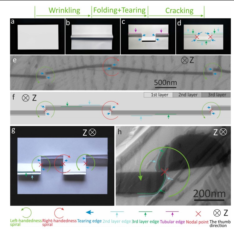 圖1. 石墨烯褶皺折疊并撕裂后的初始化螺旋生長過程。通過掃描電子顯微鏡可以看出,相鄰兩個螺旋結構的手性相反。