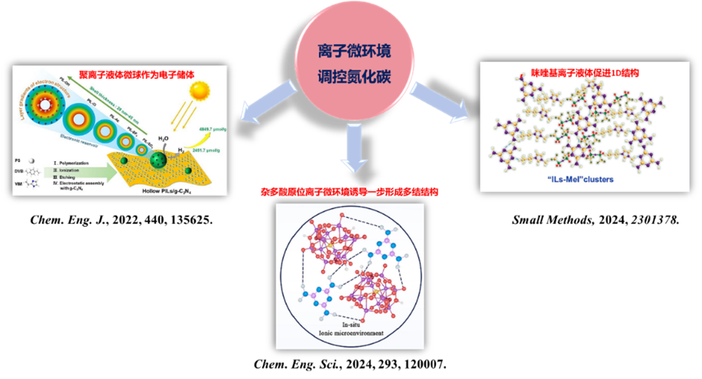 作為一種可見光響應的非金屬有機半導體,石墨相氮化碳(g-C3N4)具有合成簡單、物化性質穩定、綠色經濟、帶隙寬度合適等優點,被廣泛應用于污染物降解、光解水制氫、光動力抗菌等方面。為了彌補改善g-C3N4比表面積低、載流子復合嚴重、可見光利用率低等缺陷,需要對其進行結構改性和性能優化。作為一種可以影響材料制備、改性和應用的功能介質,離子液體自身結構可設計和調節,根據需要可以發揮溶劑、模板劑以及結構修飾劑等功能,從而在構建內建電場、異質結、均質結以及雜原子摻雜等方面具有潛在應用潛力。為此,團隊分別開展了不同類型的離子液體對g-C3N4結構及性能改性研究,旨在獲得離子液體的特殊離子微環境對于半導體催化劑的結構調控和性能提升的機制和規律。相關系列進展包括:提出了以聚合離子液體微球作為“電子儲體”的結構后修飾策略,獲得了性能提升的產氫效果( Chem. Eng. J. , 2022, 440, 135625);通過均相咪唑基離子液體作為溶劑,調控構筑“IL-Mel”簇,實現了對g-C3N4表界面性質的改善,將光降解效率提高到2.3倍,并在細菌感染傷口的光動力治療中表現出優異的性能( Small Methods , 2024, 2301378)。