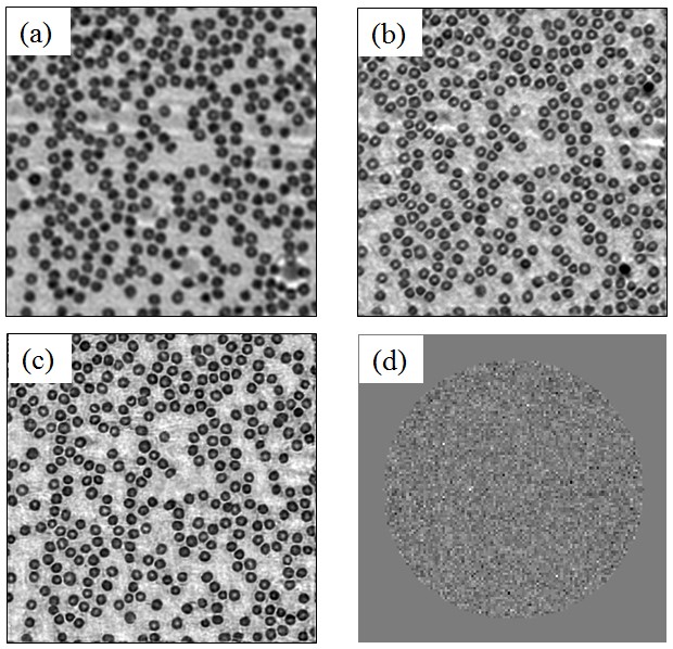 圖3 人體血細胞圖像重建結果。(a)原始低分辨率圖像;(b)未更新光瞳函數重建結果;(c)本文方法重建強度圖像;(d)本文方法重建光瞳函數