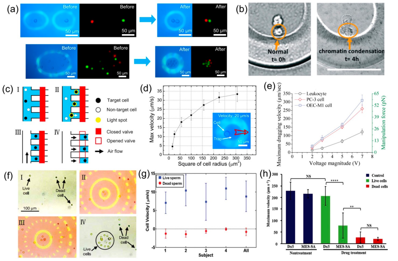在生物領域,光電鑷技術也有廣泛的應用。這些應用包括但不限于對單個細胞/分子的操作、分離和分析,對細胞固有特性的分析和獲取,細胞的電穿孔、融合和裂解以及生物組織材料的制備。光電鑷技術可直接操縱DNA分子、蛋白質分子、細胞等。在細胞操作領域,常使用光電鑷技術操控不同類型的細胞,并研究這些細胞在不同實驗條件下的運動行為(如圖5)。同時,其他基于光電鑷的多種細胞操作技術也在快速發展,例如細胞大規模陣列化技術、細胞內藥物遞送、細胞轉染等。隨著十余年的發展,光電鑷技術已成為細胞操作、細胞分析和細胞手術領域的重要技術工具。
