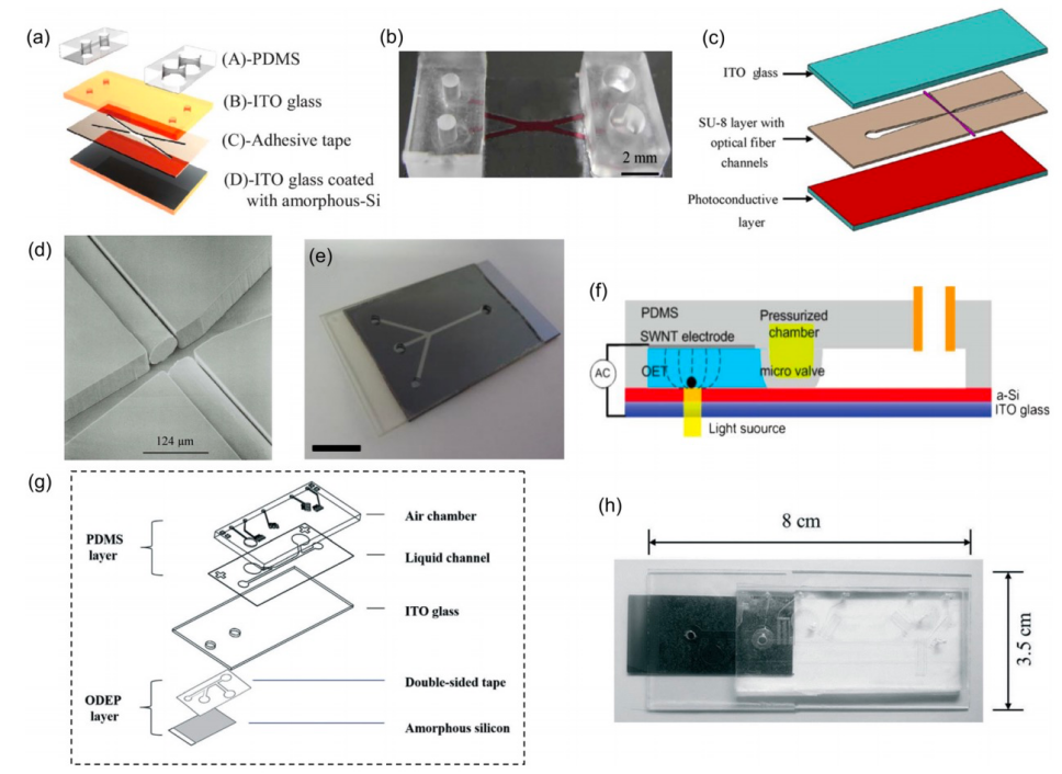 圖2為光電鑷的技術原理圖與光電鑷芯片的實物圖。光電鑷芯片一般由兩塊ITO導電玻璃基板組成,底板上鍍一層光致導電層a-Si:H(氫化非晶硅)。將含有納米/微米物體的溶液轉移到光電鑷芯片的腔室中后,施加交流電和光斑,光電鑷器件就會在光斑的誘導下產生非均勻電場。非均勻電場與納米/微米物體相互作用可以產生介電泳力,從而控制納米/微米物體的空間位置。光電鑷是一種利用半導體材料的光電效應將光場與電場結合在一起的微納操控技術,它具有如可編程性好、靈活性高、多功能性強、高通量和易于與其他表征系統集成等優勢,是一種非常先進的光操控技術。