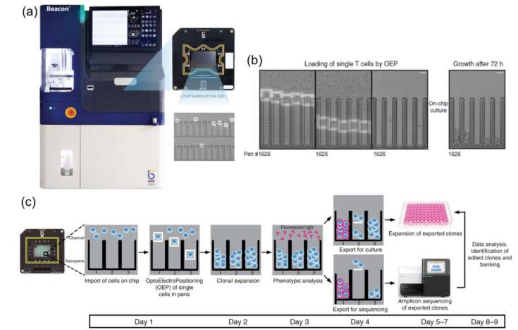 文章還介紹了光電鑷技術的產業化轉化以及該技術在抗體藥物開發領域的應用(如圖8所示)。目前基于光電鑷技術的商業化平臺Beacon(由BerkeleyLights公司研制)已廣泛地應用于細胞株篩選、細胞療法、合成生物學及抗體開發,且被世界多個頭部制藥企業采購。Beacon平臺可以有效提升功能化細胞株的篩選效率,極大縮短抗體藥物的研發時間,已被應用于篩選針對新冠病毒的中和抗體藥物。