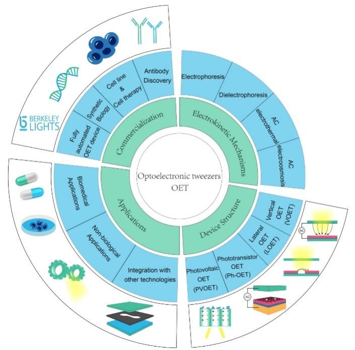 圖1. 光電鑷技術四個方面的介紹,包括技術原理、器件結構、應用場景及技術轉化