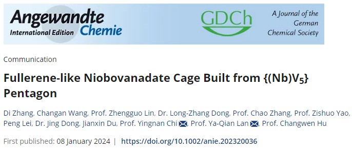 近期,北京理工大學化學與化工學院胡長文教授和遲瑛楠教授團隊在基于{Nb(V5)}五角星的類富勒烯鈮釩籠簇構筑方面取得重要進展。相關成果以“Fullerene-like Niobovanadete Cage Built from{Nb(V5)} Pentagon”為題,發表在化學領域國際頂級期刊《Angewandte Chemie International Edition》(2024, e202320036)上。北京理工大學化學與化工學院遲瑛楠教授和華南師范大學蘭亞乾教授為共同通訊作者,北京理工大學為第一通訊單位,化學與化工學院博士研究生張迪為該論文的第一作者。