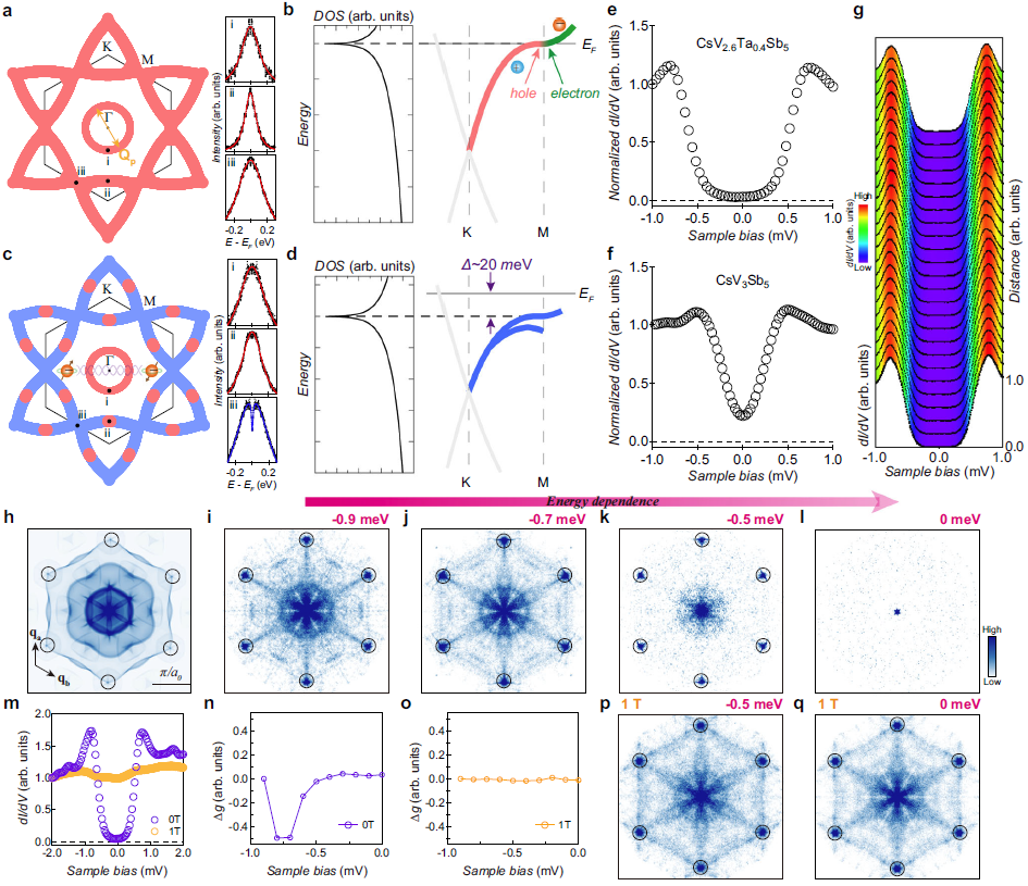 在該工作中,通過對比研究了母相CsV3Sb5和Ta摻雜CsV3-xTaxSb5(x~0.4)。我們發現CsV2.6Ta0.4Sb5材料的CDW被完全抑制,超導轉變溫度(Tc)達到最高,約為5.5K,是CsV3Sb5系列材料中觀察到的常壓條件下的最高超導轉變溫度。主要結論有:(1) 對摻雜Ta的材料進行角分辨光電子能譜儀的測試,表明籠目晶格中V 原子d軌道在費米能級的M點處形成了完美的VHS,實現了類電子帶與類空穴帶的共存。這一結果通過第一性原理計算得到定量地再現;(2)進一步證明了,CDW等競爭序的抑制不足以解釋Tc的提高,而且Tc(超導能隙)與VHS在沒有競爭序樣品中的能級位置有關。同時,隨Ta原子的替換,其他低能態及相關的電子-玻色子耦合的變化可以忽略不計。因此,該工作的結果直接建立了顯著增強的超導性和在費米能級上的VHS之間的聯系;(3)光譜成像的掃描隧道顯微鏡(STM)測量進一步揭示了CsV3-xTaxSb5(x~0.4)的超導態不同于母體CsV3Sb5。這些結果證明了范霍夫情景在籠目超導體中是可以存在的。